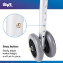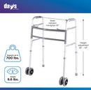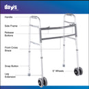 To minimize discomfort during use, the Days Bariatric Walker uses contoured hand grips that comfortably fit into the hand. The walker features rubber-like, polyurethane blend tips for stable support and is available with or without double 5” wheels. The non-wheeled walker option is equipped with convenient glide caps on the legs to prevent slipping and potential falls on all surfaces.