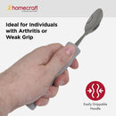 Intended to provide a comfortable meal experience for those who struggle with grip. Standard Cutlery including a knife, fork, spoon and teaspoon, is available individually or as a set, hand-washable only. Angled Cutlery features stainless steel utensils with angled heads to help individuals with limited wrist or arm movement. The fork and spoon are at 40° angles and available as left- or right-hand options. The knife is at a 90° angle and can be used without cocking the wrist. One-handed Cutlery features a stainless steel utensil with a lightweight foam handle that combines multiple cutlery functions.